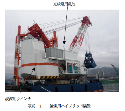 グラブ浚渫船の必要な動力は、グラブ巻上げ(土砂重量とグラブ自重)時の、最大能力より発電機関(電力)が決定されるが、巻上げ時に蓄電池より電力を補充する事により、必要な発電機関の体格を従来型より1/2〜2/3に下げる事が可能となる。初期搭載の発電機関が縮小される事により、従来型のグラブ浚渫船と比較して化石燃料の消費および二酸化炭素の排出量を削減する事が可能となる。