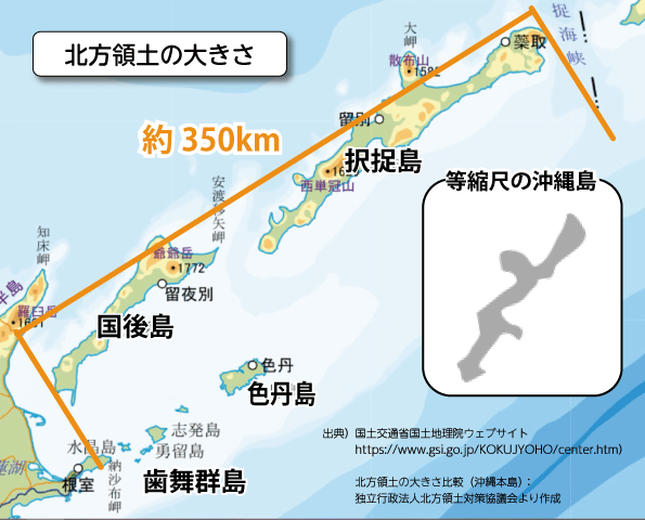 北方領土は日本地図の北東のはじっこで目立ちませんが、実はとても大きいのです。