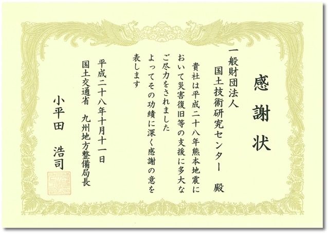 一般財団法人 国土技術研究センターでは、「平成28年度熊本地震における白川・緑川堤防検討業務」を通じて、緑川・白川の被災した堤防の原因究明、本復旧工法に関する検討を行ってまいりましたが、この度、この功績に対して、九州地方整備局より感謝状が授与されました。